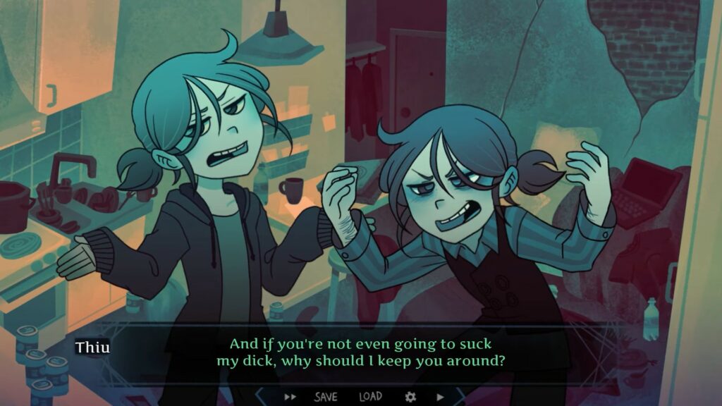 Better Half explore l’idée d’avoir soi-même en tant qu’interlocuteur, pour le meilleur et pour le pire. Le scénario propose trois routes principales, ainsi qu’une mauvaise fin : nous avons d’une certaine manière le choix du destin de Thiu. La romance fait d’ailleurs partie de l’aventure : Thiu peut littéralement finir avec lui-même. C’est la partie qui m’a fait le plus rire, d’autant leurs échanges oscillent entre le trash et l’attendrissant.