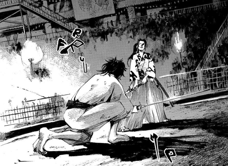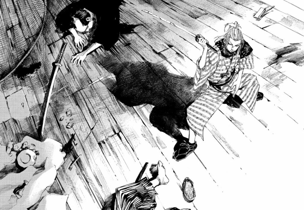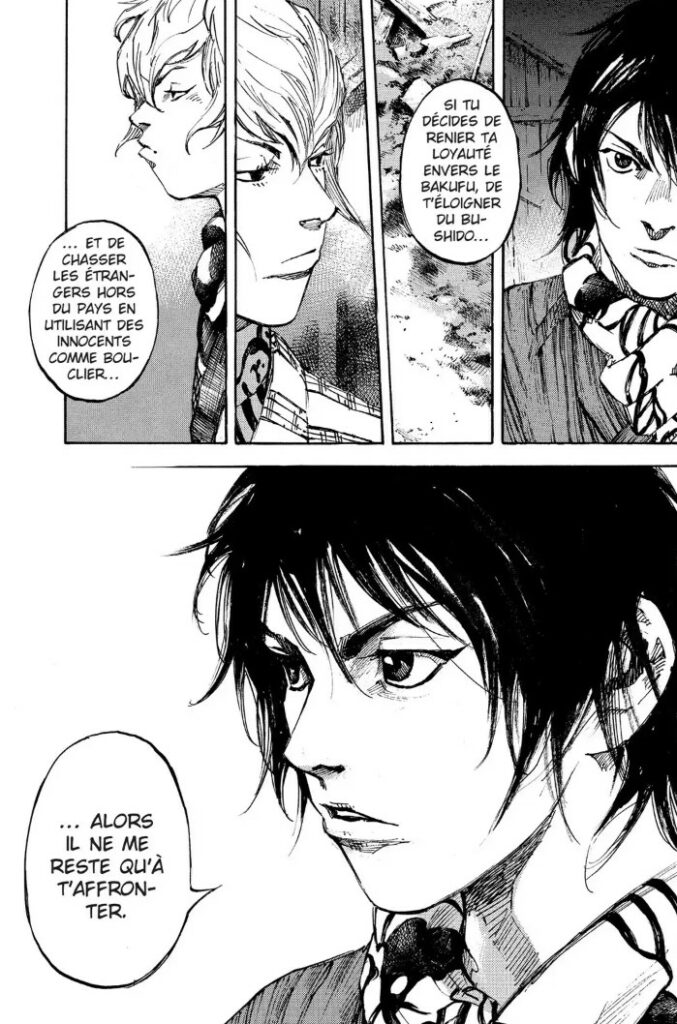 Avec la rencontre du mercenaire Kiyozo dans les premières pages, Tsutomu Takahashi délivre rapidement des clés de lecture autour de l’ambiguïté du sentiment entretenu par les frères Yukimura : mercenaire ou samouraï, finalement, n’est-ce pas la même chose ? Pour survivre, il faut tuer, quoi qu’il arrive, parfois même en bafouant son honneur. Dès lors, la question se pose : qu’est-ce que c’est qu’être samouraï durant la révolution de l’ère Meiji ?