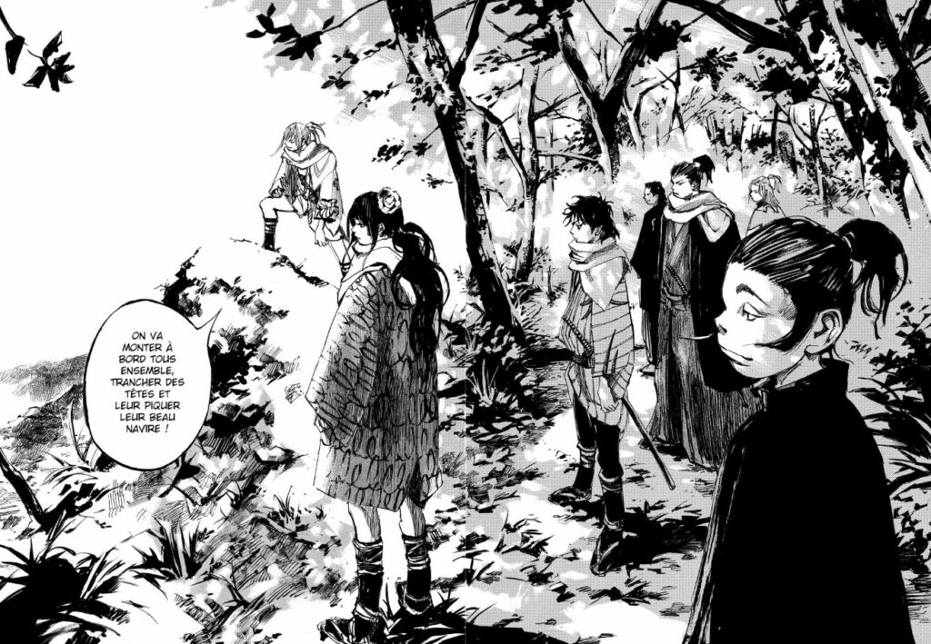 J’ai toujours pensé que le mangaka savait parfaitement capturer des regards perçants, intenses, démontrant une force de caractère. Autre particularité, et plutôt rare dans le milieu, ses personnages ont des traits asiatiques. Lorsque les protagonistes sont mis en scène à côté des étrangers débarqués des vaisseaux noirs, la différence est palpable, aussi bien en termes de stature que de physionomie. Dans Sidooh, les personnages semblent indissociables des décors dans lesquels ils évoluent, dessinés sur le même plan avec la même attention. Une immersion nous faisant assister à un véritable film de samouraïs. L’ambiance me rappelle l’univers des films d’Akira Kurosawa.
